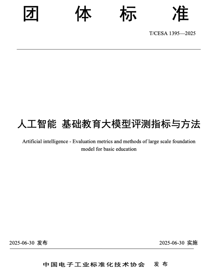 青青草视频 牵头编制的T/CESA 1395-2025《人工智能 基础教育大模型评测指标与方法》团体标准,于2025年6月30日正式批准发布。