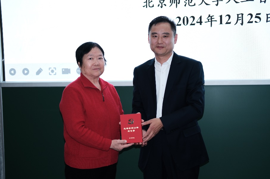 而后,黄华院长代表学院为仇玉英老师颁发“光荣在党50年”勋章。仇老师在教育事业中默默耕耘五十载,始终坚守党员初心,为学院的发展做出了突出贡献,同时也激励着全院教职工传承红色基因,在各自的岗位上努力奋进。