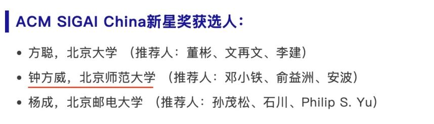 ACM SIGAI China新星奖(ACM China SIGAI Rising Star Award)是国际计算机学会中国人工智能专委会(ACM China SIGAI)设立的权威奖项,旨在表彰在中国大陆高校或科研院所工作、获得计算机或相关学科博士学位不超过7年,并在人工智能领域取得具有显著创新性和重要影响力的理论、方法或系统研究成果的青年学者。该奖项评选标准严格,候选人须为ACM中国会员,且未获得过或正在参评同类奖项。评选过程包括资格审查、专家盲审和结果公示,确保了公正性与权威性。
