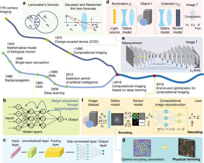 (a基础光学公式;b反向传播概念;c卷积神经网络发展历程;d计算成像框架;e基于深度学习的计算重建技术;f光学系统与图像处理的端到端联合优化;g物理孪生流程示例。)