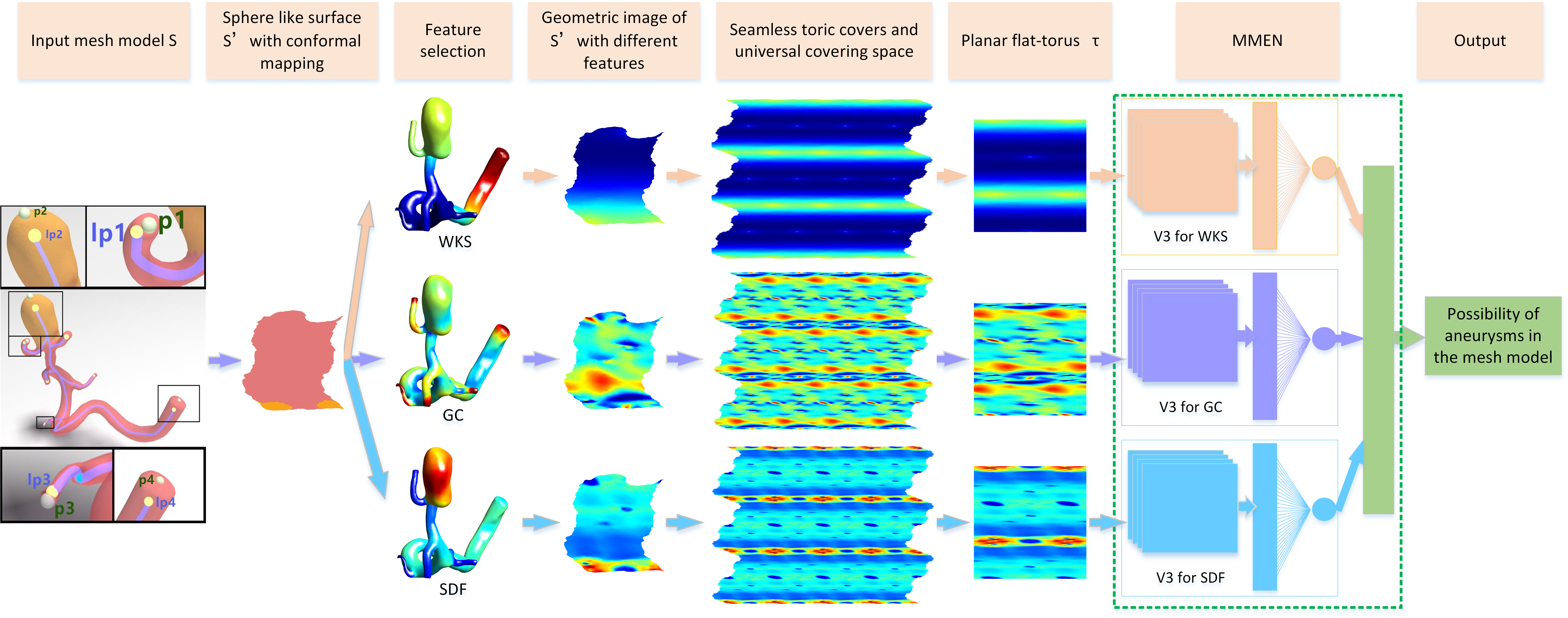 2)为了得到一个定义良好的卷积算子,我们使用全局无缝参数化方法将三维脑血管网格模型转换为平面环面,通过万用复叠空间构建几何图像表达;