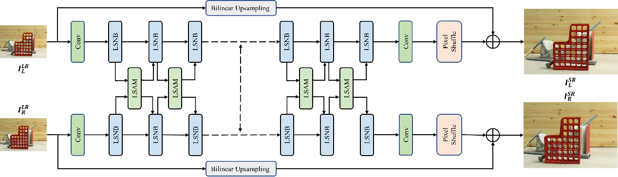 立体图像超分辨率(StereoSR)通过利用另一种视角提供的辅助信息来提高超分辨率的质量。目前的方法主要集中在细化模块设计,堆叠海量网络块来提取和整合信息。虽然性能有所提升,但内存和计算成本也在增加。为了解决这个问题,本文提出了一种自主学习网络块最优组合模式的晶格结构,能够高效和精确地获取特征表示,最终实现了轻量化的StereoSR。具体而言,本文从晶格相位均衡器中汲取灵感,设计了晶格立体NAFBlock (LSNB),通过耦合的蝶形拓扑结构,用重权重块(RWBlock)桥接NAFBlock对。RWBlock通过特征的自适应重加权,使LSNB能够探索成对NAFBlock的各种组合模式。此外,本文提出晶格立体注意力模块(LSAM),从另一个角度搜索和迁移最相关的特征。由此产生的紧密互连架构,称为LSSR,广泛的实验表明,所提出方法的性能与最先进的方法有竞争力。
