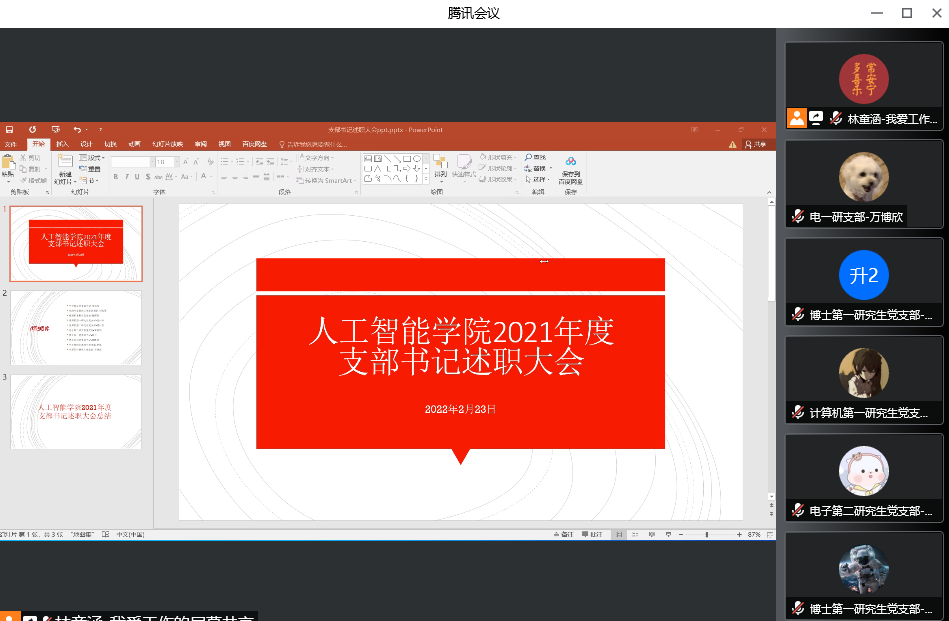 2022年2月23日下午,青青草视频 线上开展2021年度党支部书记述职评议考核工作。学院党委书记杨学玉,党委委员姚力、田沄、林定移、奚琦及全体党支部书记出席会议,校组织员李志英老师莅临指导。党支部书记述职采取现场述职和书面述职两种方式进行,按照学校“两年内每个党支部至少有1次现场述职”的要求,本次现场述职的党支部有2个教工党支部和8个学生党支部。