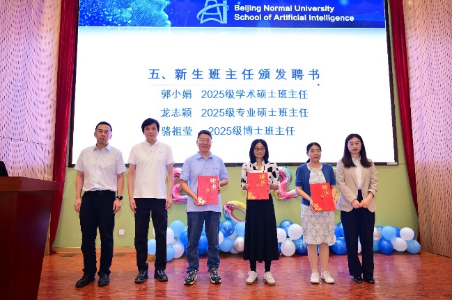随后,典礼播放了校友祝福视频。视频中,来自各行各业的优秀校友们纷纷送上对2025级新生的祝福与寄语。他们结合自身在北师大求学和毕业后的经历,分享了宝贵的经验,鼓励师弟师妹们在未来的学习和工作中不忘初心、勇于探索,将所学知识应用于实践,为社会做出贡献。这些真诚的祝福不仅让新生们感受到了来自师兄师姐的温暖,更激发了大家对未来学习生活的憧憬和向往。接下来,学院领导为2025级研究生新生班主任颁发聘书,学院高度重视班级管理服务,将全力护航新生成长旅程。