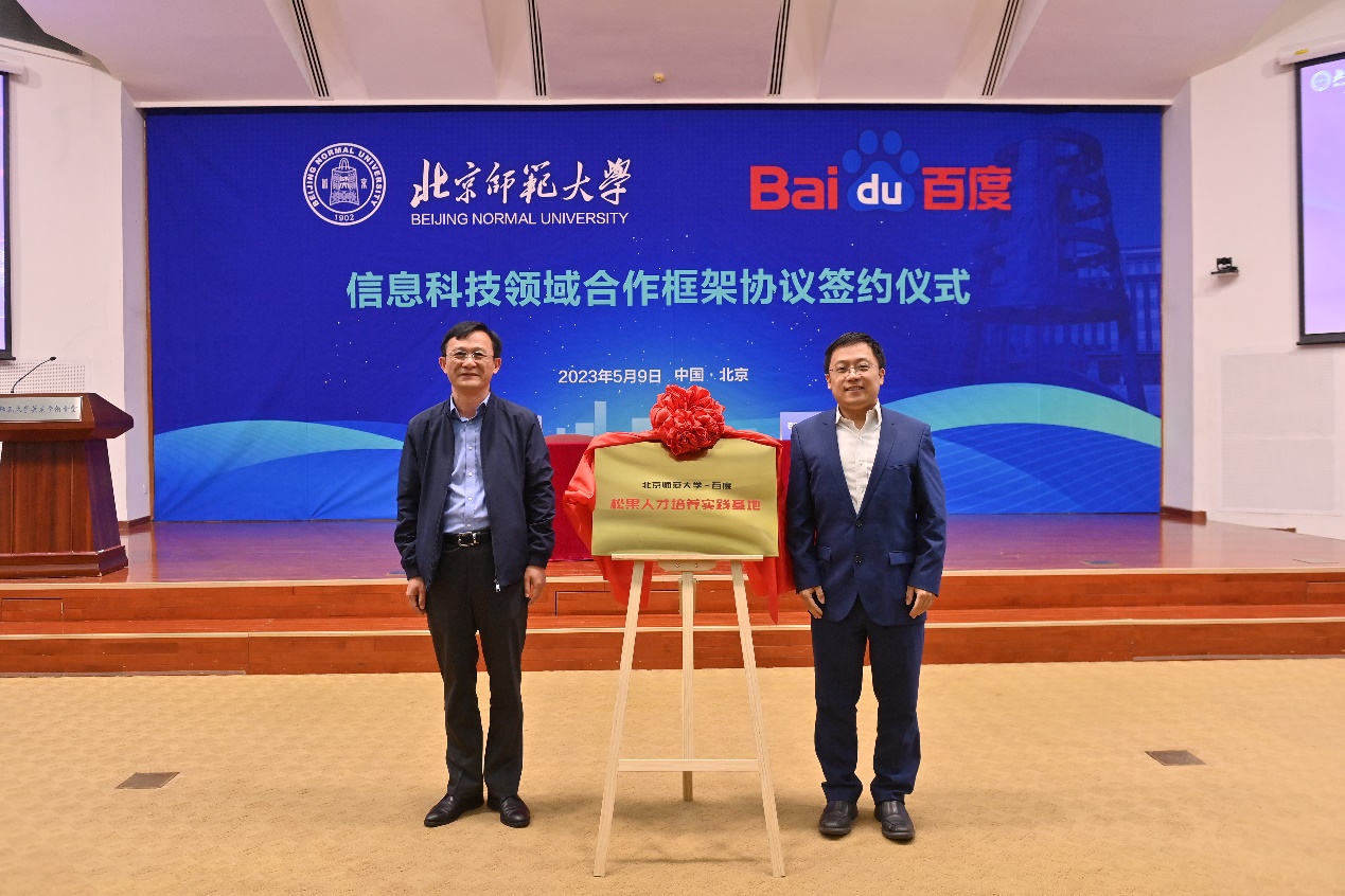 汪曙光(左)与李轩涯(右)代表双方为北师大-百度松果人才培养实践基地揭牌