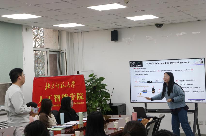 孙老师介绍了射频光子学、光学微梳以及光神经网络的基本概念;随后着重介绍了光学微梳在高速射频信号处理领域的显著优势,其能够有效提升信号处理的效率与精确度,为通信技术、数据处理等领域开辟了新路径。孙老师详细讲解了光学微梳在光神经网络的卷积加速器的应用,展现了这一前沿技术对于加速人工智能算法执行、优化神经网络性能的巨大潜力。孙老师热情介绍了ARC COMBS Centre,诚挚邀请有志于该领域研究的同学们加入,共同探索未知,推动科技进步。