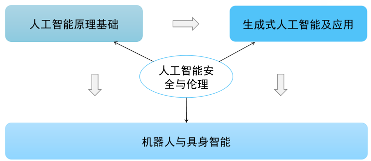 本方案将中小学人工智能教育划分为“认知、应用、创新”三个阶段,将课程内容划分为人工智能原理基础(帮助学生理解AI基本概念与主要技术)、生成式人工智能及应用(探索语言大模型和多模态技术的现实应用)、机器人与具身智能(从硬件搭建到智能交互,形成完整实践链条)、人工智能安全与伦理(贯穿其它三部分教学过程,引导学生思考技术治理与社会责任)四个部分。这四部分之间的关系如下图所示。