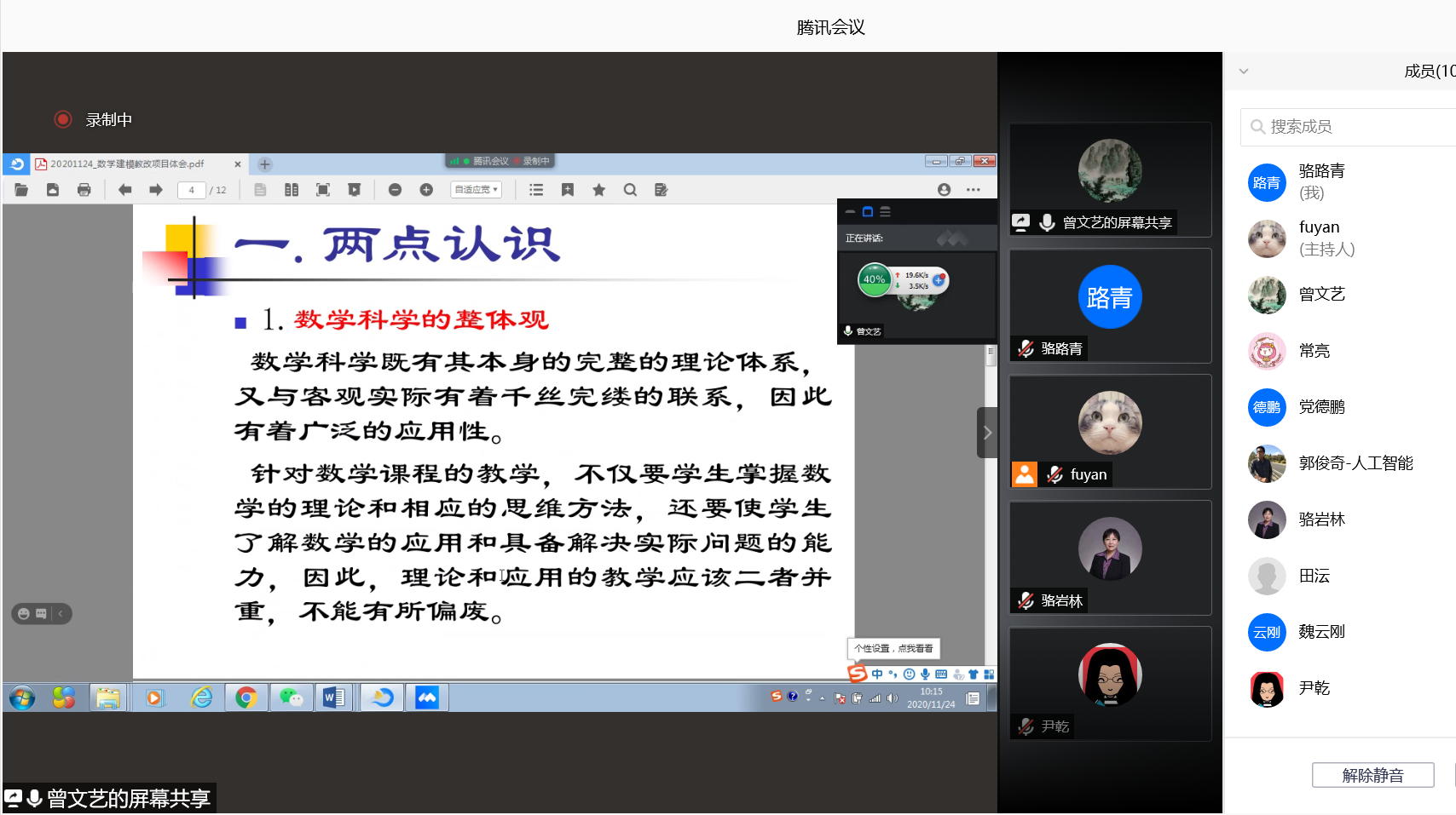 二、教改项目推进座谈会——11月24日,青青草视频 教学建设与改革项目座谈会通过腾讯线上会议方式举行。三位2019年度教学方法改革项目的支持人分享了教改项目建设的经验。计算机科学与技术专业系主任付艳老师主持了会议,会上曾文艺老师通过“‘数学建模’课程教学模式的实践与探索”项目分享了数学课建设的难点及重点;尹乾老师通过“程序设计教材之Python语言”项目分享了学科基础课程教材建设的注意事项;常亮老师通过“‘人工智能与智慧教育’课程的实践与探索”项目分享了通识课程建设的要点。除主讲嘉宾外,本科教学副院长郭俊奇老师、2020年新立项教改项目的党德鹏老师、骆岩林老师、魏云刚老师,也参加了会议,并对项目建设与执行进行了积极探讨。