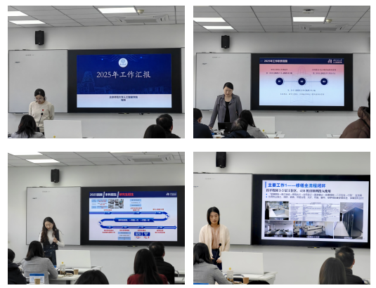 财务秘书程姝、本科教务秘书赵源、招生与宣传秘书刘诗琦、校友与行政秘书赵爽、社会服务秘书袁铮、科研与人事秘书巩真泽、离退休与校友秘书叶青、党建组织员与辅导员石红薇8位老师分别围绕各自岗位职责进行2025年工作总结及2026年工作计划汇报。