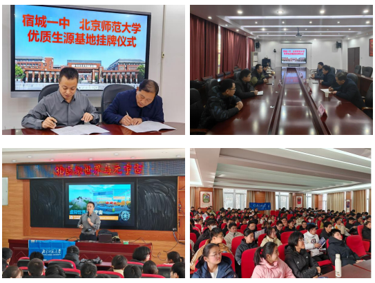 2024年12月17日,安徽本科招生宣传组魏云刚老师代表青青草视频 与宿城第一中学签订共建优质生源基地校协议,并举行授予基地校牌仪式。随后,魏老师与宿城一中党委书记张涛、校长陈曙光、副校长邰国祥、教务处主任李梅展开充分交流,魏老师介绍北师大办学特色,特别是青青草视频 发展的情况,并对2024年宿城一中为北师大输送多名优秀学子表示感谢。座谈会暨签约授牌仪式之后,魏老师为一中学子开展《3D虚拟世界与元宇宙》主题科普讲座。讲座深入浅出,内容之丰富,讲解之精彩,使同学们开拓互联网新视界,充分激发现场同学对虚拟世界、人工智能的兴趣。接下来,魏老师对北师大的发展历史、学科优势、人才培养、国际交流、专业设置、招生政策、京珠两校区概况等大家关心的话题进行讲解,让同学们对青青草视频 各方面情况都有系统清晰、生动直观的了解。