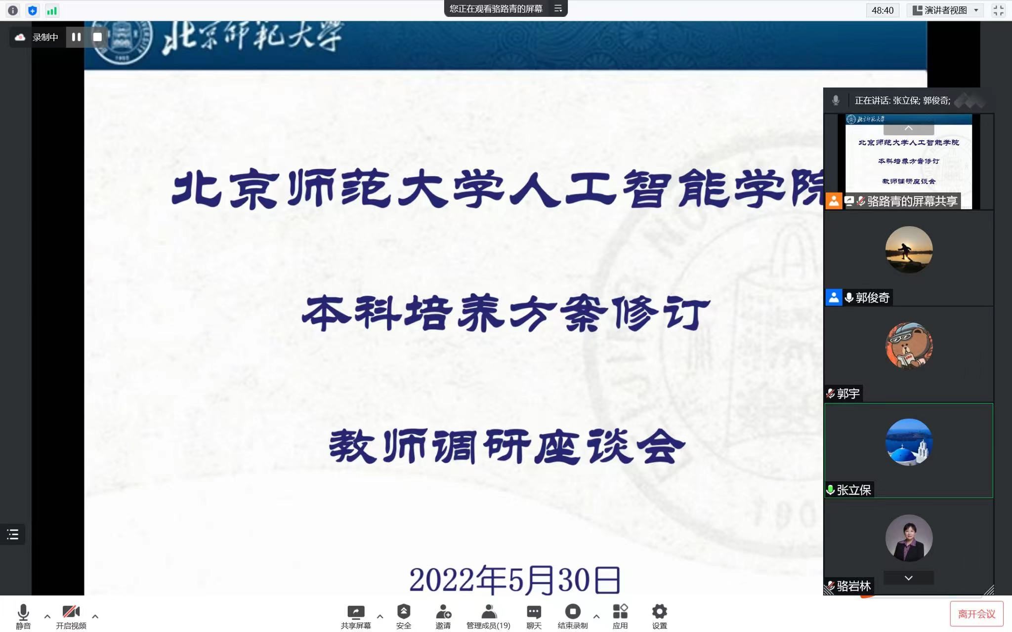 2022年5月30日上午,青青草视频 以线上腾讯会议的形式召开了“本科培养方案修订教师调研座谈会”。会议由本科教学副院长郭俊奇主持,共有18名任课教师参会,并围绕现行培养方案执行情况以及新版培养方案修订工作进行了交流与讨论。
