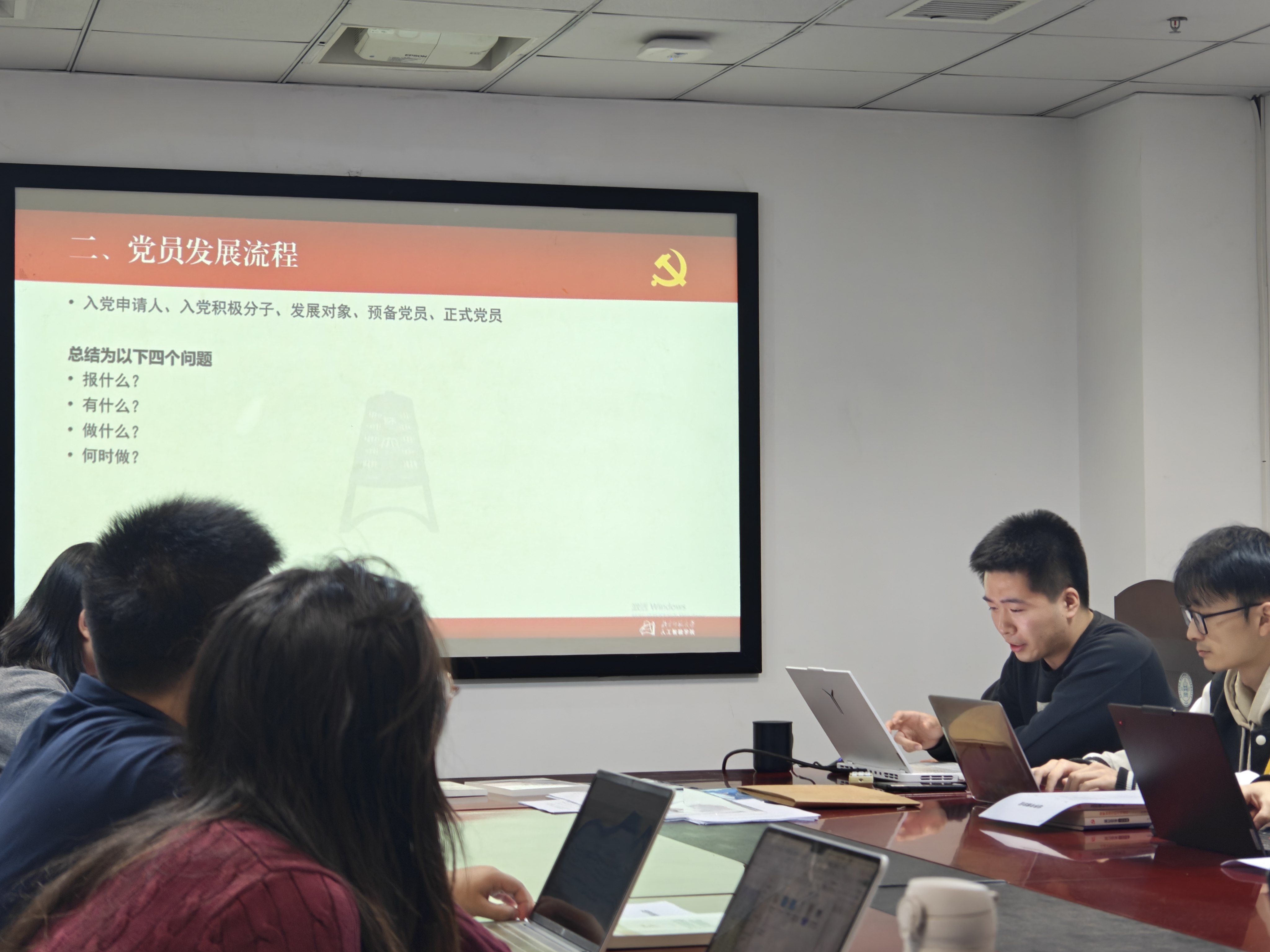 随后,学院学生组织员、博士第一研究生支部书记张恒轩讲解了支部党员发展、日常管理、经费使用、系统操作等内容并明确有关工作要求。张恒轩将党员发展流程总结为“有什么”“做什么”“报什么”“何时做”四个基本部分,准确介绍确定不同阶段时间的方法,使各位支部书记、委员掌握了基本工作技能。张恒轩还对近期重点工作作了说明。