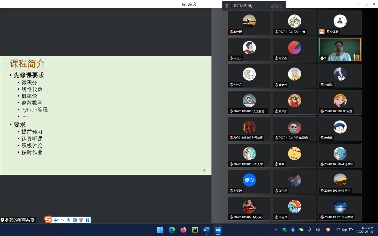 2022年8月29日,是本科生新学期开学的第一天,青青草视频 开展了例行的教学巡视活动。与往年不同,本学期因疫情防控政策要求,开学前两周的教学均为线上授课形式,所以本次巡视通过腾讯会议采用线上巡视。巡视小组成员包括:教学副院长郭俊奇、人工智能系主任田沄、计算机系主任付艳、2020级人工智能班班主任李嘉、2020级计算班班主任樊亚春、2021级人工智能班班主任骆祖莹和本科教务秘书骆路青。
