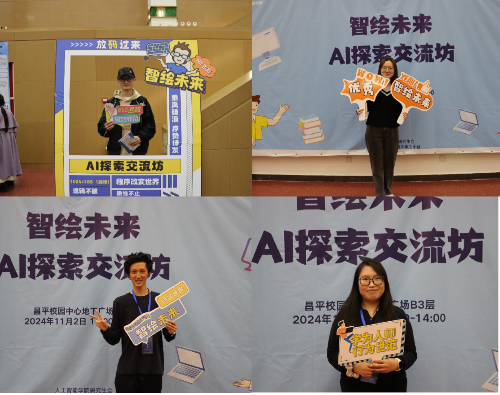 2024年11月2日,人工智能学在昌平学生社区举办“智绘未来”系列活动,活动分为AI探索交流坊、智能文化街区、“智绘未来”师生晚会三个模块,共计600余人次参加。