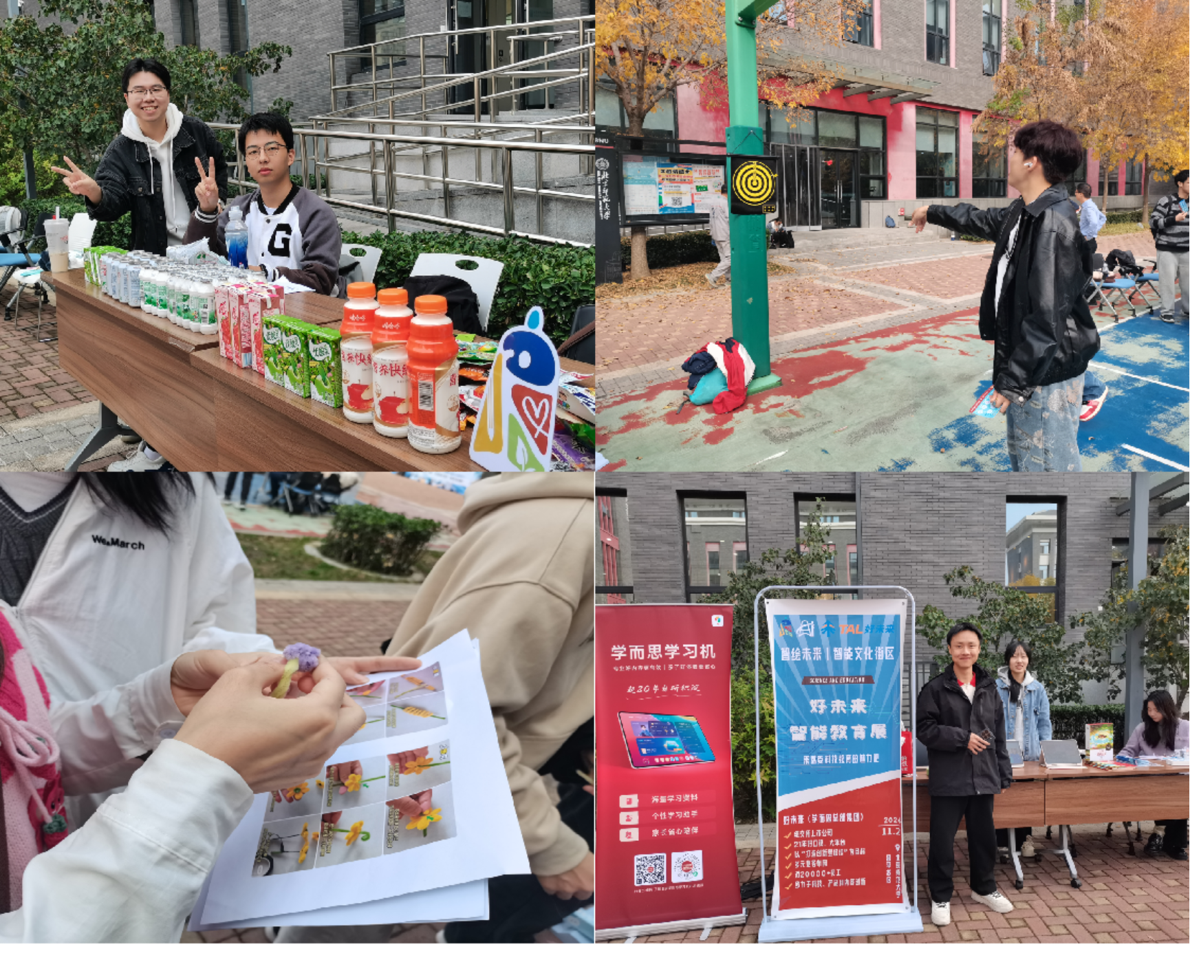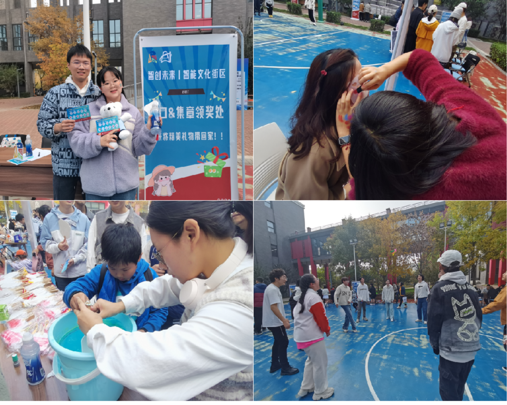 “智能文化街区”外场活动共社设11个展位,包括“童年游戏区”体验各色游戏、漆扇制作、人脸彩绘、球王争霸、镖尖飞扬、体感游戏机、棋王争霸、“追寻童年记忆”童年游戏大赏、自制棉花糖等,活动以游园形式开展,参与同学在每个展位体验活动并盖章认证领奖。活动现场气氛热烈,体现了新技术和旧时光的交融,展示了青青草视频 师生的活力。参与师生表示,通过活动感受到了昌平校园的美景和学院的团结凝聚,希望未来继续在昌平学生社区参加师生喜闻乐见的活动。