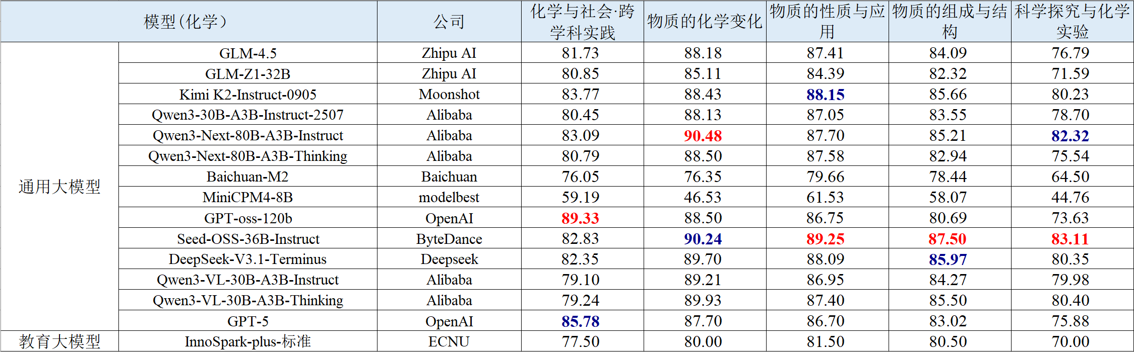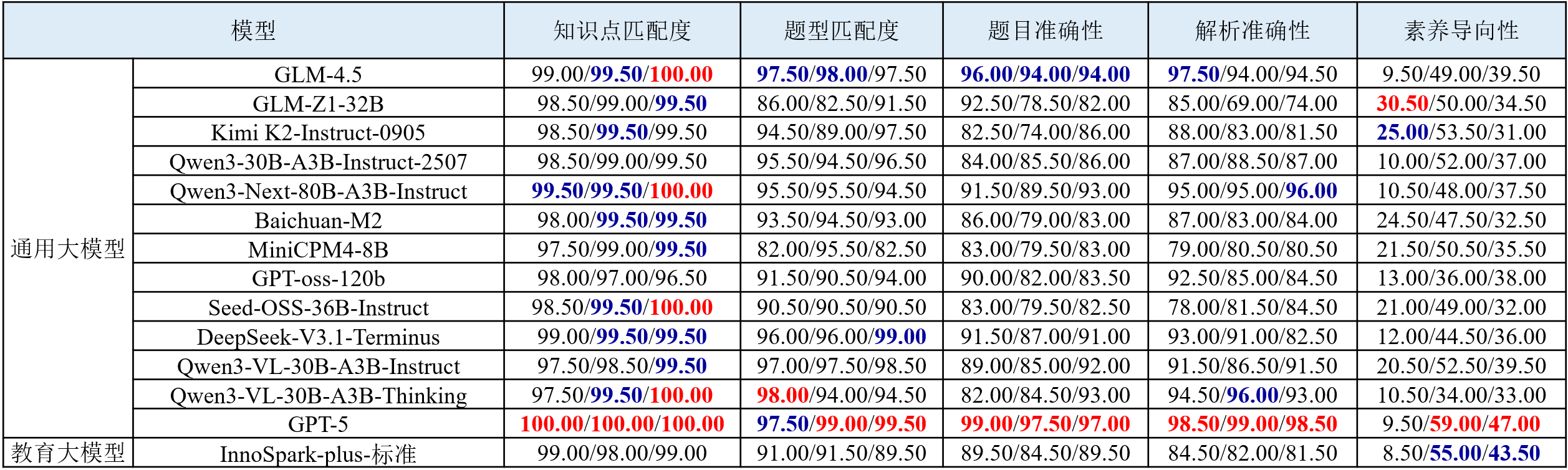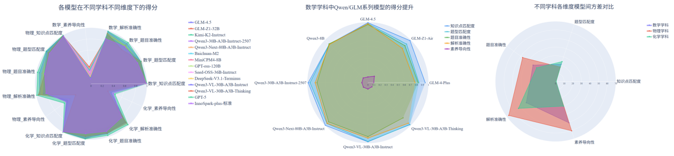 (2) 国内主流系列模型在知识与解析能力上持续提升。与上一期榜单相比,国内头部模型在核心生成指标上普遍提升,特别是Qwen3系列在知识点匹配度与解析准确性维度上均稳步提升,其中Qwen3-Next-80B-A3B-Instruct在物理与化学学科的解析准确性上较之前的模型均有明显提升。此外,GLM-4.5相较于其前代GLM-4,也在所有维度上实现提升。