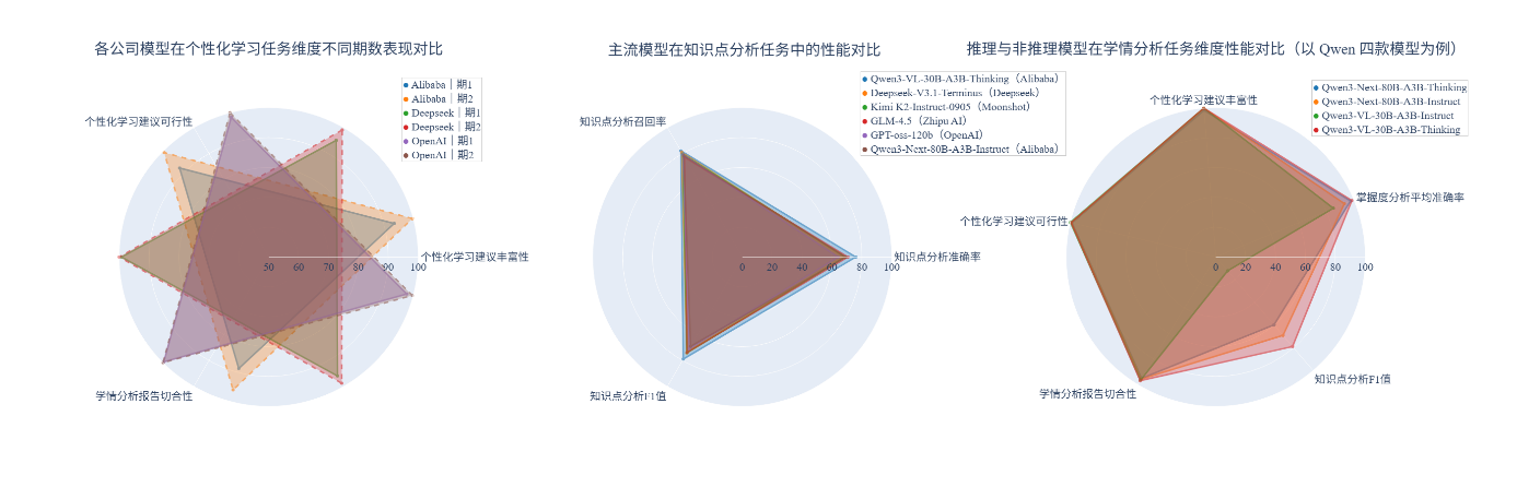 (1) 相较首期榜单,模型在个性化学习建议任务上性能提升。此次评测的多款模型在个性化学习建议相关维度上性能提升明显,其中Qwen系列即使在小规模参数量下依然发挥优异,这表明在目标明确、框架清晰的特定应用任务上,模型优化已取得一定进展,且模型能力不完全依赖于参数规模。