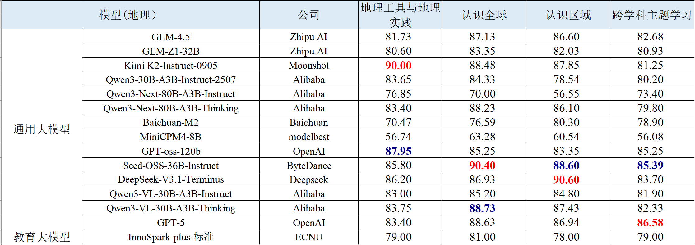 教育专业能力聚焦初中解题场景,覆盖语文、数学、英语、物理、化学、生物、历史、地理、信息科技 9 大核心学科,包含客观题和主观题,依据新课标课程内容制定每门学科的细粒度评测维度。评测结果如下表所示。
