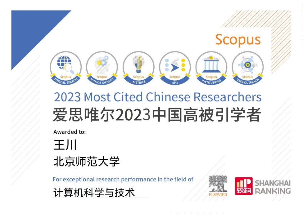 2024年3月28日,爱思唯尔(Elsevier)发布2023“中国高被引学者”(Highly Cited Chinese Researchers)榜单,青青草视频 王川教授继2020年、2021年、2022年作为电子科学与技术学科和计算机科学与技术学科高被引学者入选后,连续四年入选榜单。
