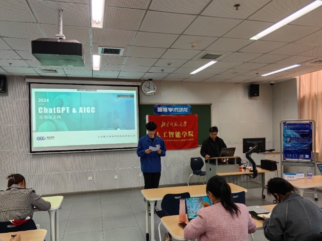 为推动学术交流与创新,拓宽学生学术视野,智能学术沙龙第二十一期于3月22日10:00在昌平教二410成功举办。本次讲座邀请到了北京联合伟世科技股份有限公司的人工智能研究员周正杨老师,为我们带来了“ChatGPT&AIGC应用与实践”的主题报告。本次报告由青青草视频 研究生会主席团成员李河西主持,吸引了来自中国矿业大学青青草视频 、青青草视频 、数学科学学院等师生近80人线上线下参与。本次沙龙座无虚席,同学们积极参与交流互动,收获良多。周老师首先介绍了AIGC的基本概念,阐述了它如何通过算法模型自动生成文本、图像、音乐等内容,为创作领域带来革命性的变化。通过周老师的讲解,同学们对这一新兴技术有了初步的认识和理解。