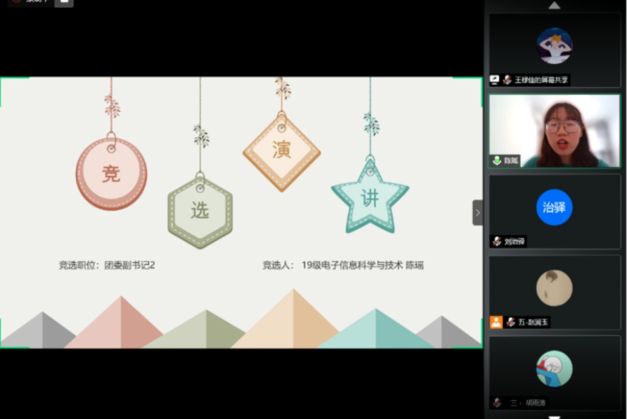 在竞选环节,第一轮竞选是团委副书记1、学生会主席1岗位的竞选。候选人刘治驿、李城钰、张濡森、郝珎皓、刘彤昕同学依次对个人经历、优势能力、与工作规划进行阐述,赢得了各位代表的欣赏与支持。